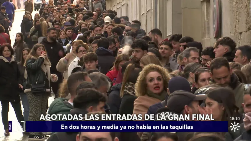 En tan solo dos horas y media se agotaron este jueves todas las entradas para la Gran Final del concurso de agrupaciones del Carnaval de Cádiz. La lluvia no pudo con las ganas de conseguir una de ellas.