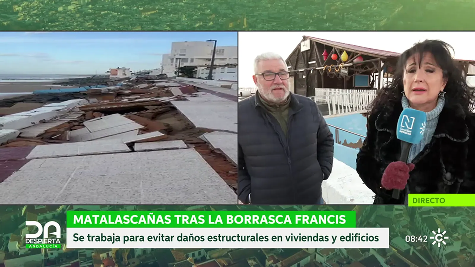 Más de un kilómetro y medio del paseo marítimo de Matalascañas, en Huelva, ha desaparecido a consecuencia de la borrasca 'Francis', que prácticamente se ha comido la playa. Ahora la mayor urgencia es evitar daños estructurales en viviendas y edificios, y para ello una pala mecánica realiza aportes de arena y piedras en los bajos. Efectivos de la Unidad Militar de Emergencia están elaborando un informe de daños. El Ayuntamiento de Almonte ha solicitado al Gobierno la declaración de zona catastrófica. Además hay edificios enteros en riesgo. Hay dos chiringuitos destruidos por la última borrasca y un tercero está a la espera de caerse. Nuestra compañera María José Martínez ha hablado con su propietario, Paco Triana.