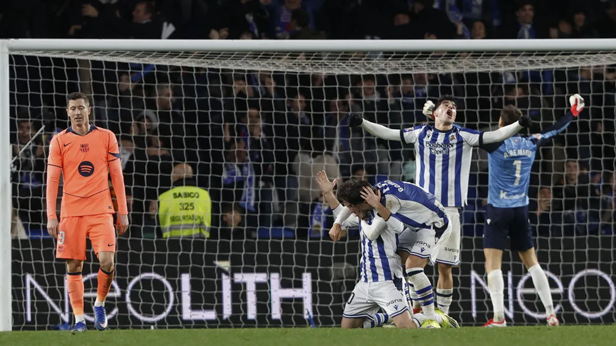 Los locales tuvieron la sentencia en un cabezazo en plancha de Oyarzabal y otra que sacó Cubarsí bajo palos, y el último arreón de los de Flick, con uno más por una roja directa a Carlos Soler en los vascos, dejó un larguero de Koundé, otro poste de Rashford, casi gol olímpico, y una tamborrada que al final sí se celebró dos días antes en Donosti.