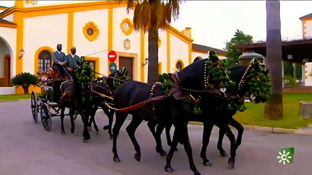 Más 30 caballos de pura raza española, de capa negra. Se les doma en la disciplina del enganche. Hasta tres horas lleva preparar un enganche de cinco caballos. Visitamos una yeguada en Jerez de la Frontera especializada en la disciplina del enganche, una tradición que hunde sus raíces en el manejo agrícola.
